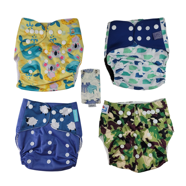 4 Fraldas de Pano (de diferentes marcas: Elinfant, Happy Flute, Littles and Bloomz e Mumsbest)